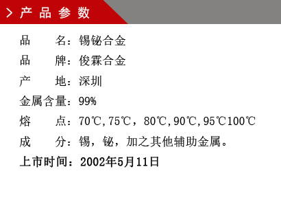 俊霖錫鉍合金是鉍同錫、銻、銦等金屬組成的合金,稱之為錫鉍合金。錫鉍合金屬于環(huán)保型合金.常溫下,呈固態(tài)、銀白色熔點(diǎn)為138℃,固液體積收縮率為0.051%。