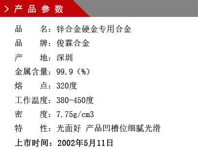 俊霖鋅合金硬金專用合金是由鋅金屬合成,再配以銅鋁鎂等微量元素融合,具備材質軟硬適度,光面好,易修胚,焊接拋光電鍍效果佳;綜合原有鉛基合金、鋅合金產(chǎn)品的優(yōu)良之處,解決了原鉛錫合金材料高成本,流動性不夠,產(chǎn)品硬度韌性欠缺、后期工藝難處理的現(xiàn)象。
